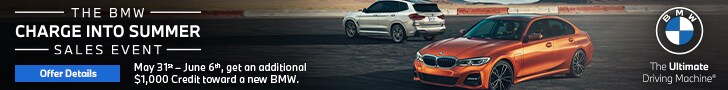 $1,000 offer is only available during The BMW Charge Into Summer Sales Event - May 31, 2021 through June 6, 2021 - and valid on eligible vehicles leased or purchased from participating dealers and delivered May 31, 2021 through June 6, 2021. Eligible models include All MY2020, MY2021 and MY 2022 BMWs. MINI vehicles and BMW Pre-Owned/CPO vehicles do not qualify. Retired Service Loaner vehicles and Demonstration vehicles that have accumulated over 7,500 miles do not qualify. BMW Company vehicles and any other vehicle that has accumulated 5,000 or more miles also do not qualify. This offer cannot beused for vehicles previously ordered or delivered before May 31, 2021 and is only valid on delivery of in-stock vehicles. Offer valid to The BMW Charge Into Summer Sales Event participants and their family members residing within the same household. Offer valid on final negotiated lease or purchase price andmay be combined with other applicable BMW offers that are available at the time of purchase, except, that it may NOT be combined with other redemption code offers from previous events. It also may not be used toward tax, title, destination and delivery charges. Only one redemption code per vehicle may be used. Only valid at participating dealers. Please see your participating BMW Center for complete program details. The BMW name, model names and logoare registered trademarks.
