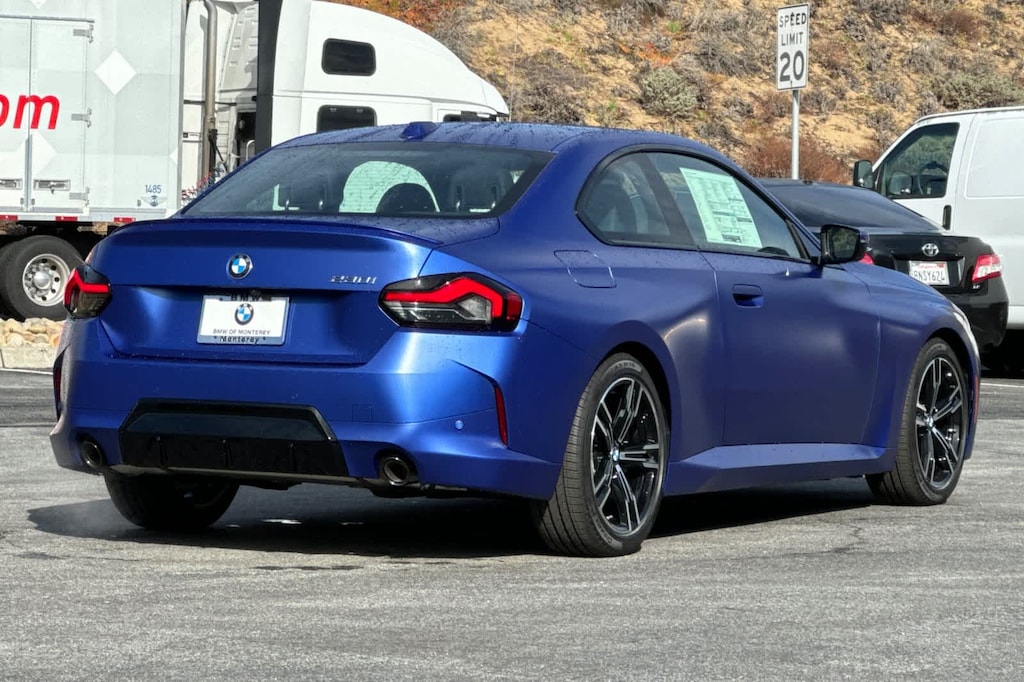 PREMIUM PACKAGE Remote Engine Start, Adaptive Full LED Lights, Live Cockpit Pro w/Head-Up Display, Heated Steering Wheel, Moonroof, Automatic High Beams, Universal Garage-Door Opener, M SPORT PACKAGE Wheels: 18 x 7.5 M Dual-Spoke, Style 848M, Bicolor, M Steering Wheel, Rear Spoiler, M Sport Pkg, Variable Sport Steering, M Fine Brushed Aluminum Interior Trim, Without Lines Designation Outside, M Sport Suspension, Aerodynamic Kit, harman/kardon® SURROUND SOUND SYSTEM. BMW 230i with Frozen Portimao Blue II Metallic exterior and Black w/Blue Stitching interior features a 4 Cylinder Engine with 255 HP at 5000 RPM*.
